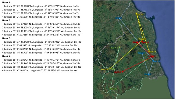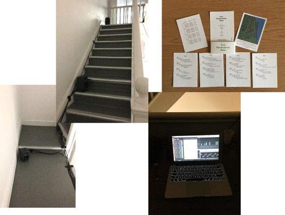 I visited each set of four – termed a Rant after the traditional Northumberland dance tune – in sequence during one day and recorded my walking to and from the site as well as the recording at the site for a randomly determined time (of up to four minutes). The rants were played in sequence each through a single speaker of a four-channel installation, located in a stairwell.